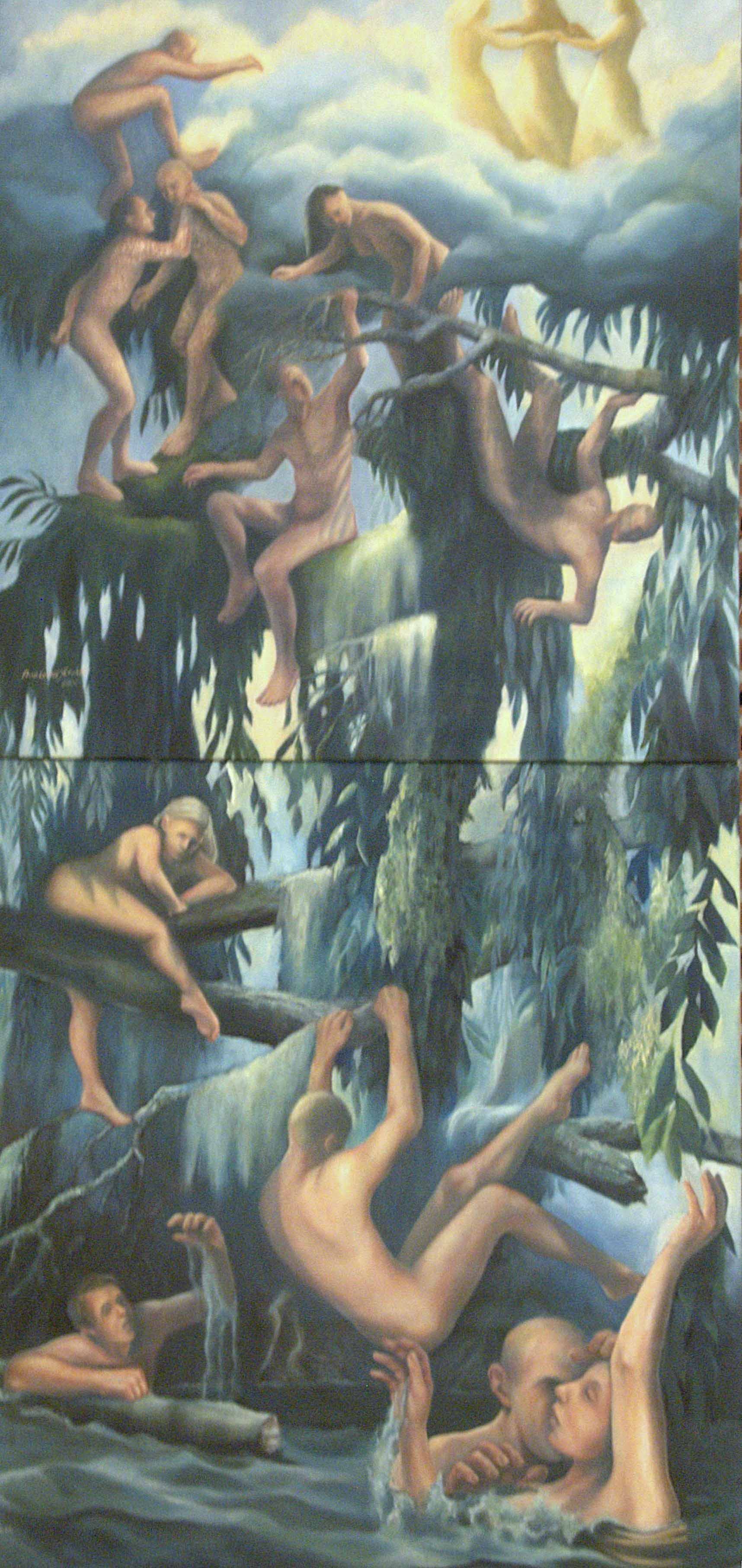 titel Yggdrasil, en "diptyk" i olja på duk, ev. tempera i undermålningen, storlek 268x128 cm. pris 30000,-