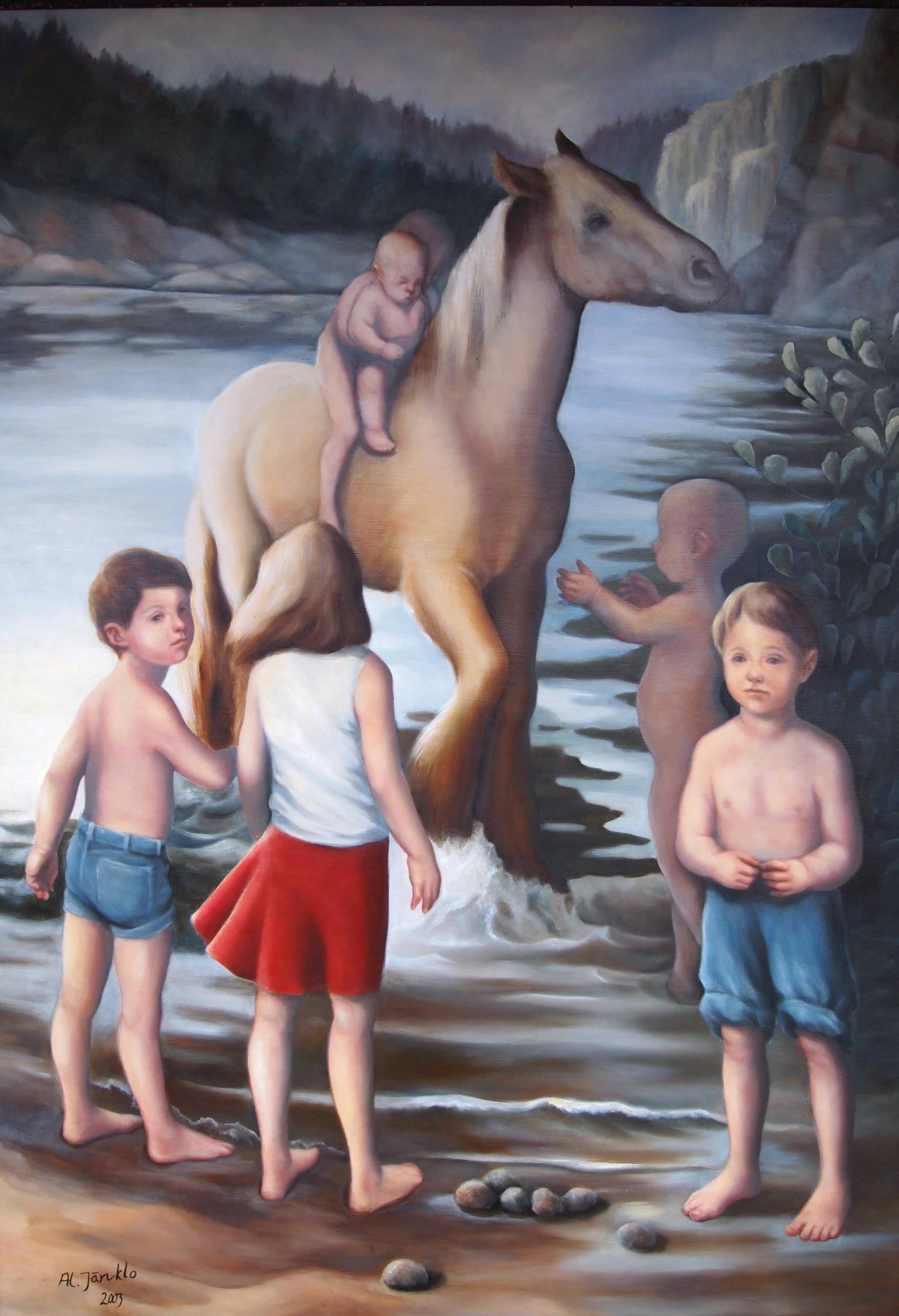 titel Bäckahästen, olja på duk i storlek 221x160 cm. ramad, pris 30000,-