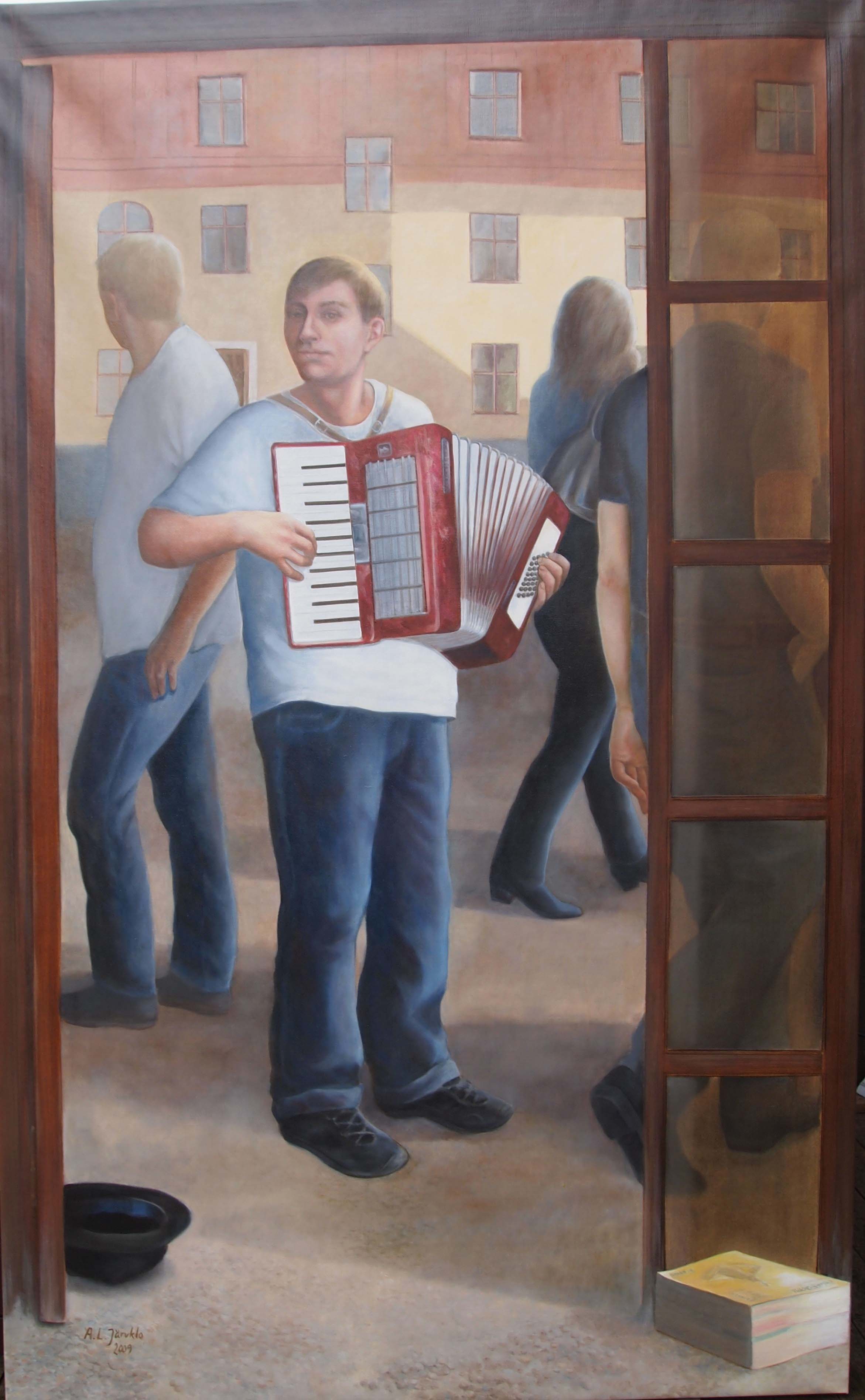 titel Gatumusikanten, on olja på duk i storlek 206x126 cm. pris 30000,-