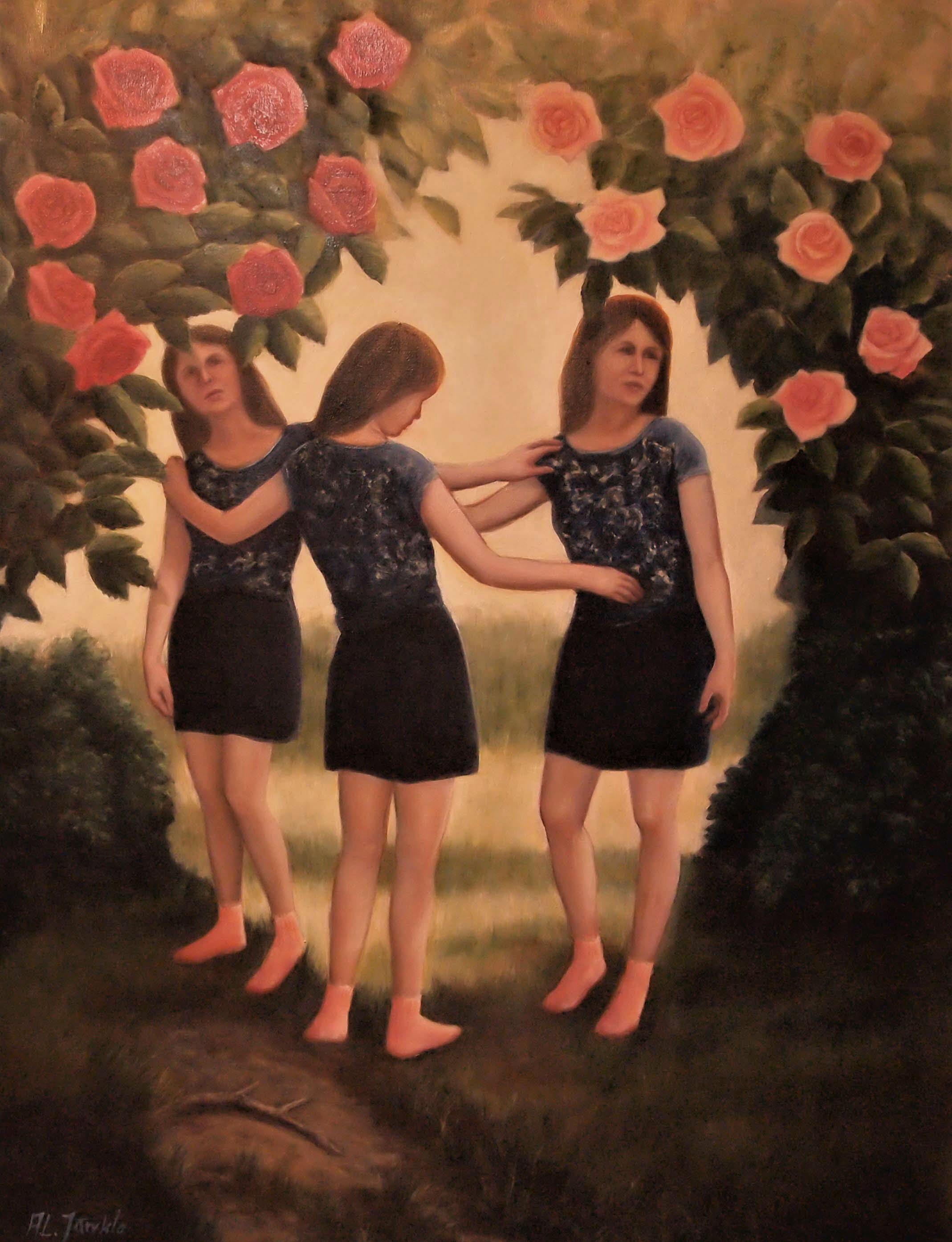 titel Vi är så unika, en olja på duk i storlek 90x70 cm. bilden handlar om ett ungdomsminne, pris 5000,-
