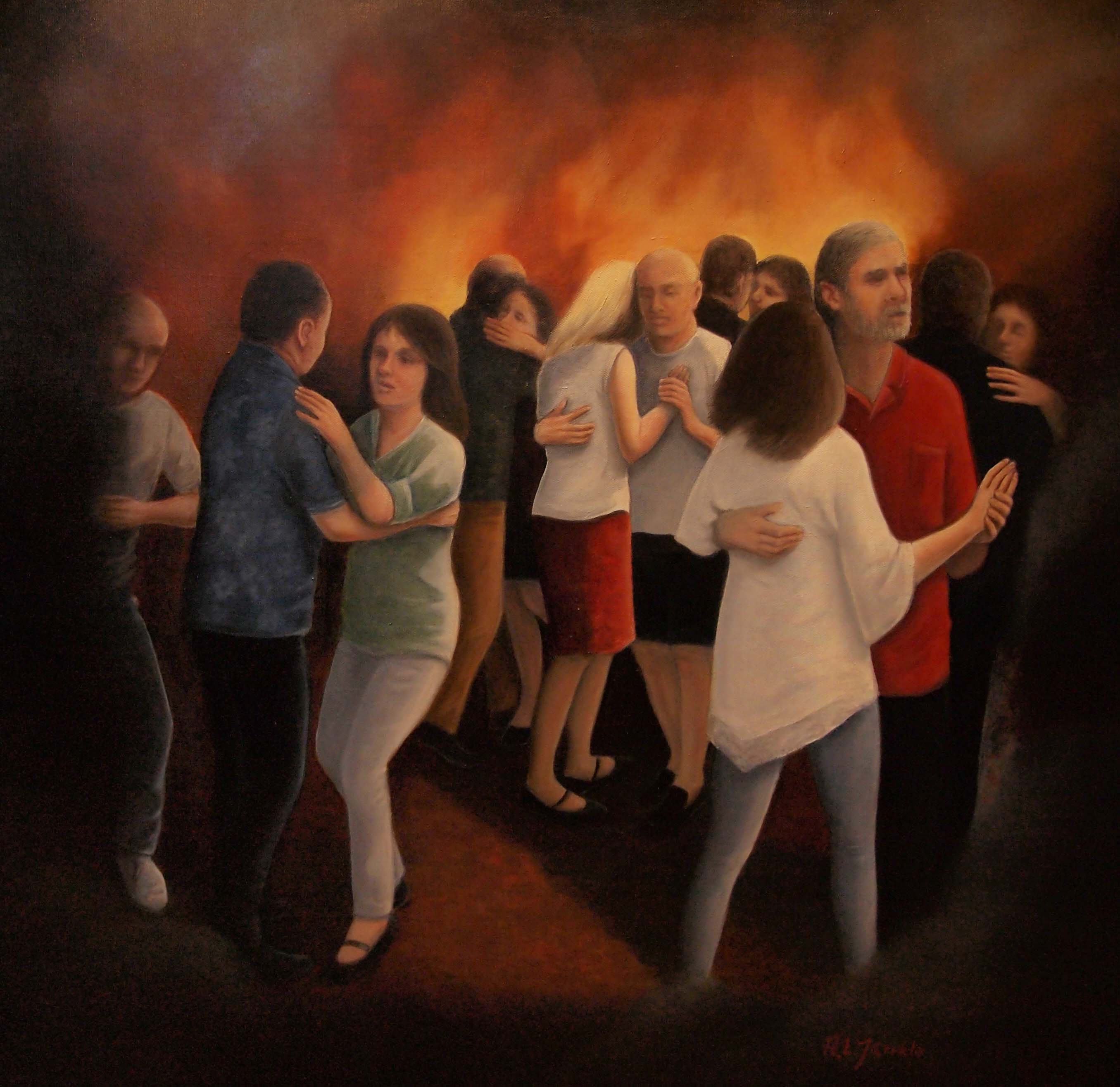 titel Dansen går vidare, en olja på duk som ingår i en serie om de fyra elementen, storlek 85x90 cm. pris 5000,-