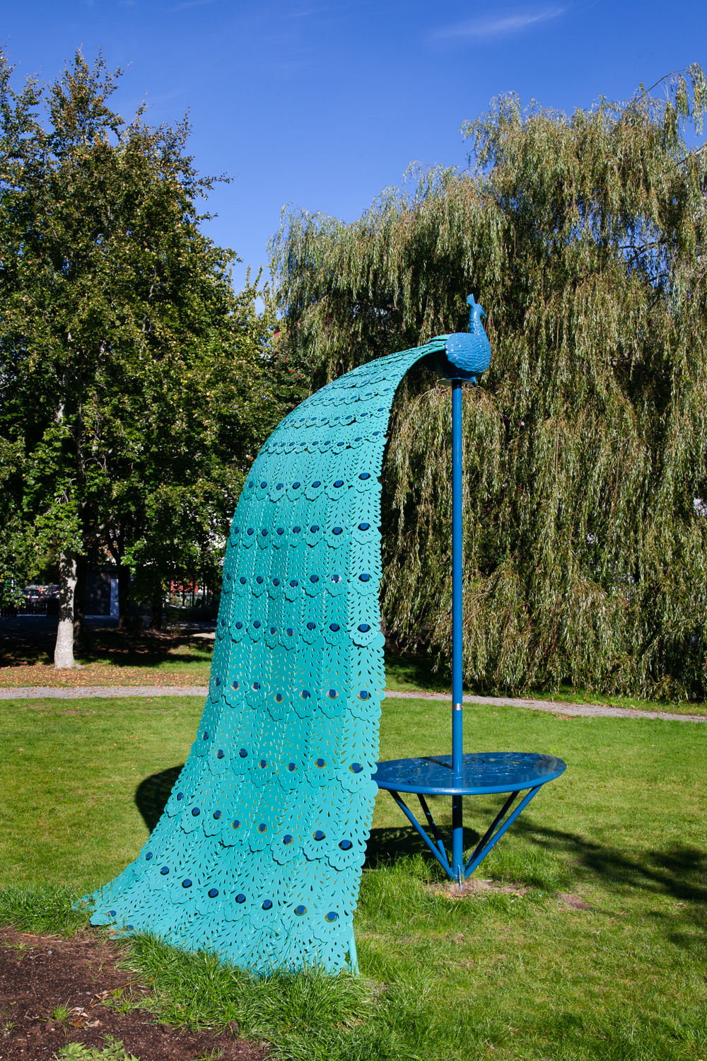 Påfågeln Panoptes, 2025. Skulptur i stål och aluminium med plantering Anemonen förskola Norsborg, Botkyrka kommun