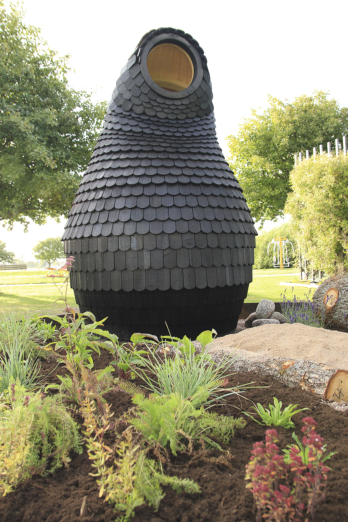 Chrysalis är en skulptur eller en byggnad, en varelse, en ande eller ett tempel. Planteringen framför erbjuder ett mikrohabitat för insekter. Mariestad 2022