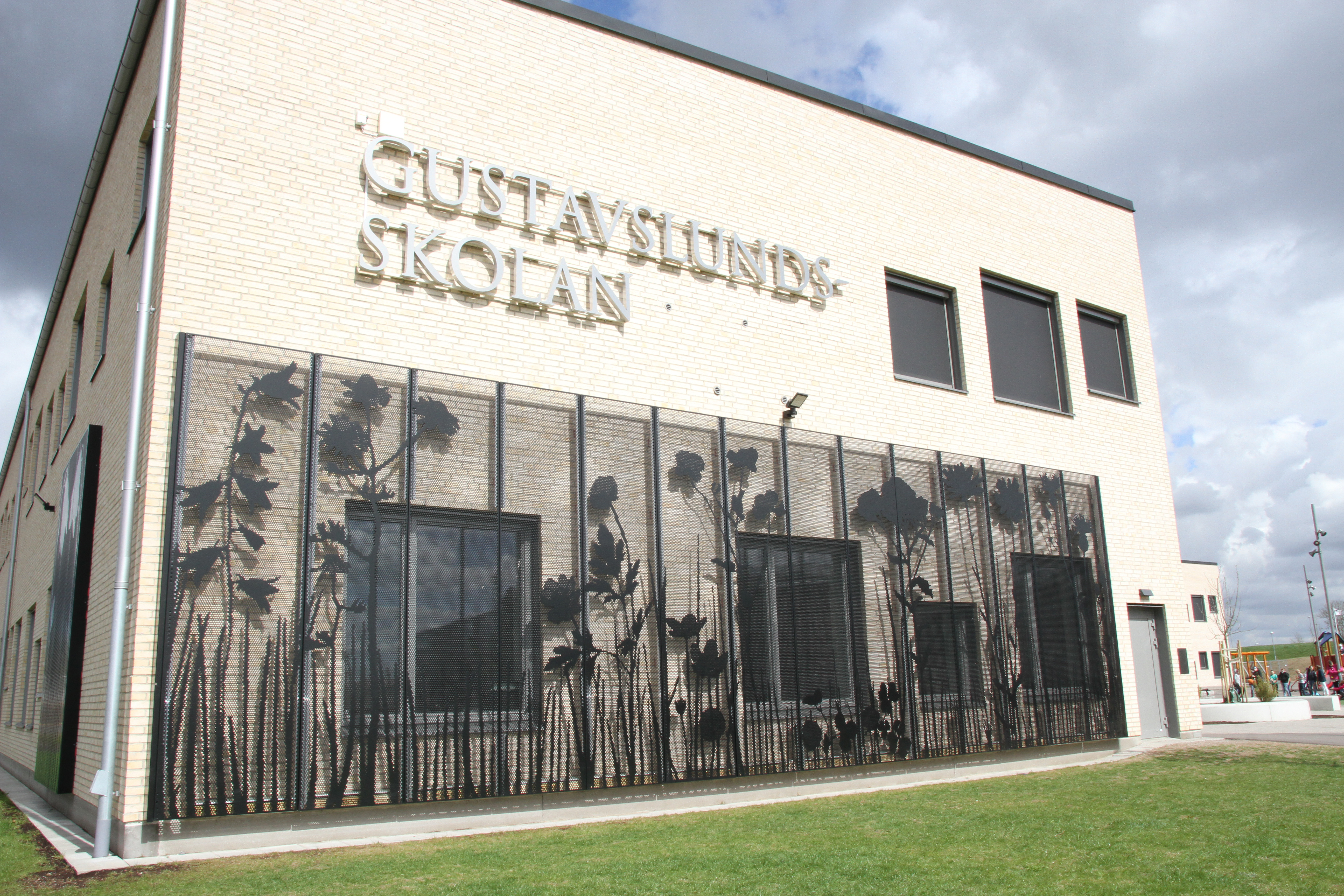 Väggäng. Material: Lackerad aluminiumplåt, tegelsten, trä. Västra och södra fasaden på Gustavslundsskolan, Helsingborg, uppdrag av Helsingborgs stad 2017