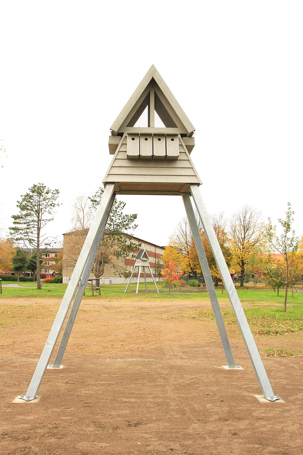 En vinge rörde mitt hår. Material: Trä, galvaniserat stål, LED belysning. Mått: Ben ca 300 cm, hus ca 150 x 180 cm. Norra tynnered, Göteborg Konst 2017